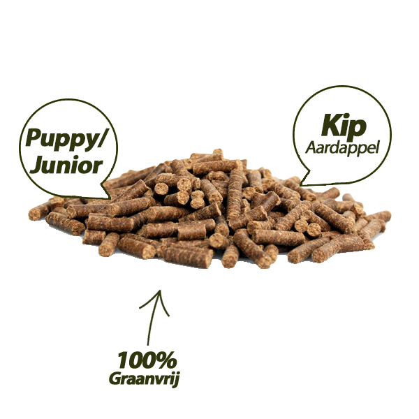 Superieur (Premium) Geperste Puppy/Junior Kip & Aardappel is een 100% graanvrije puppy/junior voeding voor pups van alle rassen. Deze graanvrije puppy/junior brok is een uitstekend begin van ieder hondenleven. Door de hoogwaardige en goed opneembare ingrediënten is de puppy/junior brok een voedzame keuze voor puppy’s en opgroeiende honden.