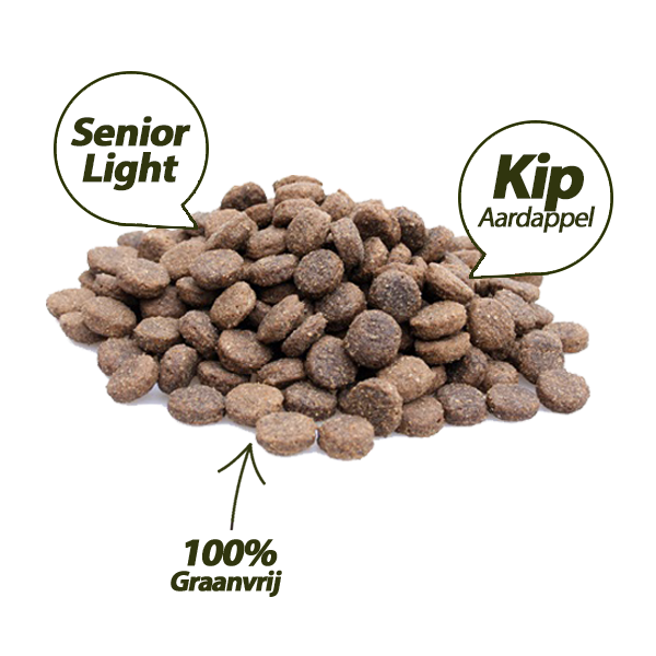 Superieur (Premium) Senior/Light Kip & Aardappel is een 100% Graanvrije voeding voor voor oudere honden vanaf 8 jaar, en honden met overgewicht en honden met neiging tot overgewicht.